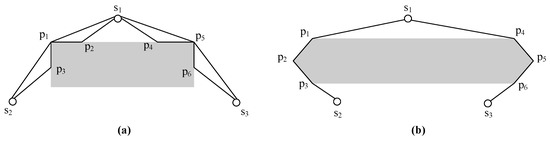 In this case, we have . If the is the MST of all nodes , then due to the characteristics of a convex hull. It is obvious that . Let denote the straight skeleton built within . Theorem 3 ensures , which implies and . According to Theorem 4, is a 3-; therefore, the approximation ratio of is 3.