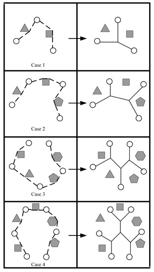 It is apparent that a straight skeleton has property 1 as described in Section 3. More importantly, we give the comparison between the length of the SMT and that of a straight skeleton in Table 3. It is obvious that each straight skeleton is almost as long as an SMT in every scenario that implies the fact that a straight skeleton is closely approximating the SMT. In addition, if the topology of the disconnected network can be decomposed into a series of convex hulls, then, according to Equations (2), (4) and Theorem 6, one can deduce that the approximation ratio of OASS can be reduced to with the value of r properly chosen.