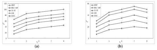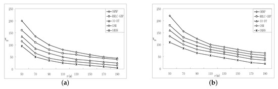 Figure 6a,b show the required number of RNs while varying node communication range with and , respectively. It is obvious that, as the communication range increases, RNs required for each approach decrease. It is clear that RRLC-GBP consumes less RNs than ORNP due to the fact that, compared with CoM, the zero gradient point is the point such that sum distance from all representatives to which is minimized. This is also confirmed in the simulation results, as shown in Figure 6a,b. Furthermore, the GSR shows better performance than ORNP, RRLC-GBP and IO-DT. The reason for that is: (1) ORNP and RRLC-GBP, as s, will repair the connectivity with a tree longer than the straight skeleton built by GSR as proved earlier; (2) the structure established by IO-DT that consists of 3-stars is similar to a straight skeleton; however, the RNs required are more than that of a straight skeleton. The OASS shows an excellent result compared with ORNP, RRLC-GBP, GSR and IO-DT as the communication range intensively increases. The reason is that a small count of RNs is deployed from all representatives along the tree that consists of straight skeletons along with the proper representative selection, as proved earlier.