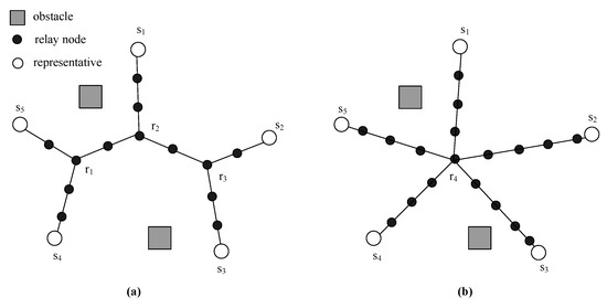 - Abbas, A.; Younis, M. Establishing connectivity among disjoint terminals using a mix of stationary and mobile relays. Comput. Commun. 2013, 36, 1411–1421. [Google Scholar]