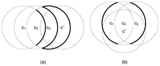 In this case, an arc of is divided into three arcs by . An example is shown in Figure 1a, where a boldly marked arc of , , or is divided into three new arcs by (marked by dashed lines). We refer to the original arc as , and the three new arcs as , , and in the clockwise direction, respectively. We consider the following two intersection conditions: (i) does or does not intersect an arc of () inside ; (ii) does or does not intersect an arc of () outside . By combining the above two intersection conditions, we have the following 4 subcases of intersection.