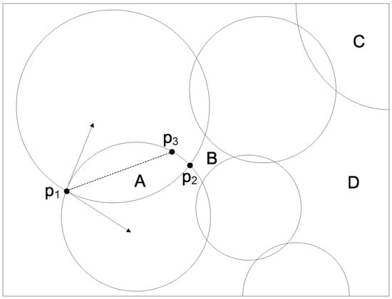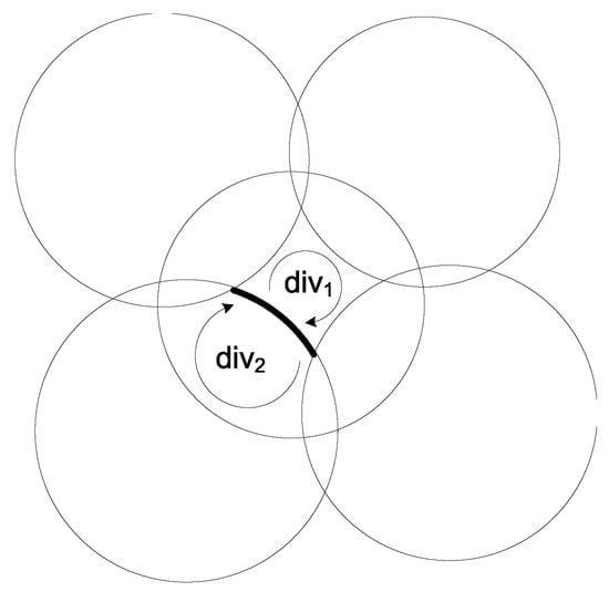 The second step for division calculation is to determine all divisions formed by the intersected circles calculated at the previous step. This problem appears to be computationally challenging in geometry, but it turns out that tracing all possible divisions can be done in polynomial time. In fact, Huang et al. pointed out that the total number of intersected divisions could be as many as , where m denotes the number of circles, but they did not provide a proof [15]. Here , we provide a rigorous derivation for a tight upper bound on the total number of divisions intersected by m circles in an infinite 2D plane. We shall start from the following lemmas.