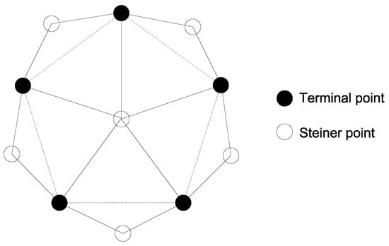 We provide a tight example of Theorem 6 in Figure 4, where five terminal points are located at the corners of a pentagon (dashed lines) with an edge length greater than . One Steiner point is located at the center and five other Steiner points are located outside the pentagon. The distance between any two terminal points is greater than , and the distance from any terminal point to the central Steiner point is less than . An optimal solution should add the central Steiner point to the set of terminal points, but Algorithm 3 may add the other five Steiner points to .