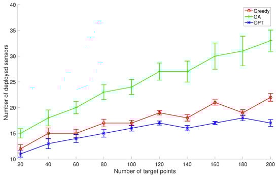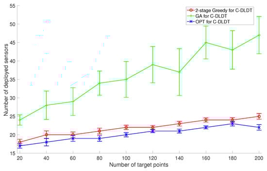 In the first set of experiments, we set the number of discrete sensor locations to 100 and set k to 2, and compare the average performance of GreedyDLDT with the GA-based approach and the optimal solution as the number of given target points varies from 20 to 200, as shown in Figure 5. The increasing trend in these performance curves indicates that more sensors need to be deployed to cover more target points. We observe that GreedyDLDT consistently outperforms the GA-based approach, and the number of deployed sensors computed by GreedyDLDT is close to that computed by the optimal solution. Also, GreedyDLDT exhibits a very stable performance as indicated by a small standard deviation in each problem size.