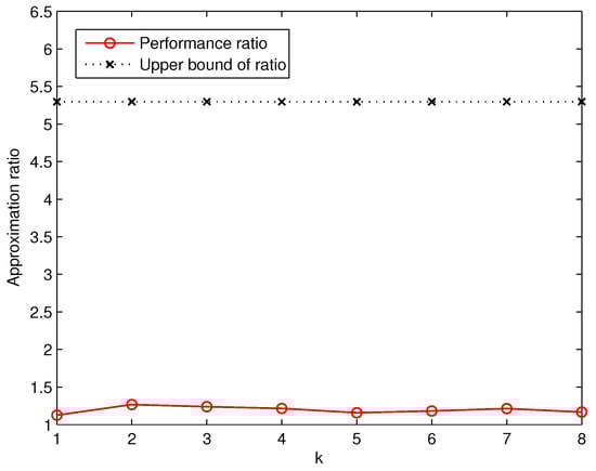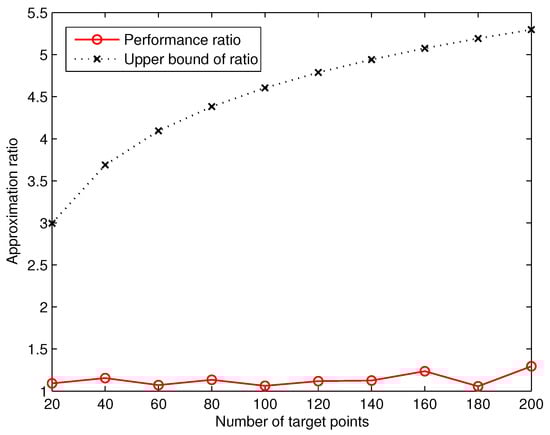 Based on the number of deployed sensors computed by GreedyDLDT and the optimal solution, we are able to measure the actual approximation ratio of GreedyDLDT. We plot in Figure 6 the measured average approximation ratio in comparison with the theoretical one. We observe that the actual approximation ratio of GreedyDLDT is much smaller than the upper bound () defined in Theorem 2, where n is the number of target points. These results shed light on the promising performance of the proposed method in solving such sensor deployment problems in practical applications.
