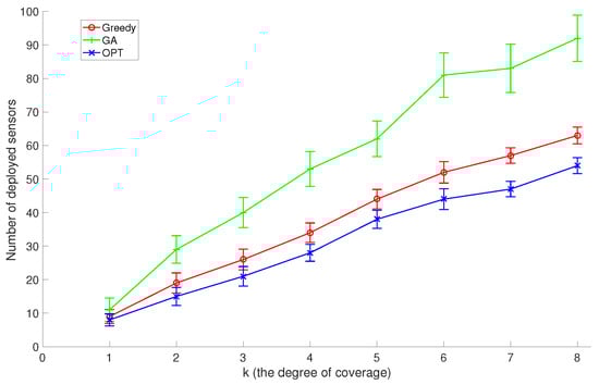 In the simulation, we consider a 3D cube of dimensions 100 m × 100 m × 100 m as the region of interest, where a given number of discrete sensor locations and target points are randomly placed. Each sensor has a sensing diameter of 25 m ( m) covering a spherical space. We conduct two sets of experiments. In the first set of experiments, we fix both the number of sensor locations and the degree of coverage, and vary the number of target points; while in the second set of experiments, we fix both the number of sensor locations and the number of target points, and vary the degree of coverage. Note that each experiment is repeated 20 times with different random seeds and the average number of required sensors with a standard deviation is measured for comparison between different algorithms.