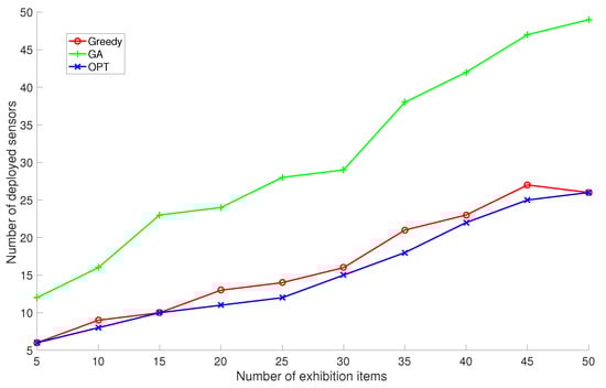 Performance comparison of GreedyDLDT (Greedy), Genetic Algorithm (GA), and Optimal Algorithm (OPT) for a museum exhibition hall with sensor mounting constraints in response to a varying number of exhibition items.