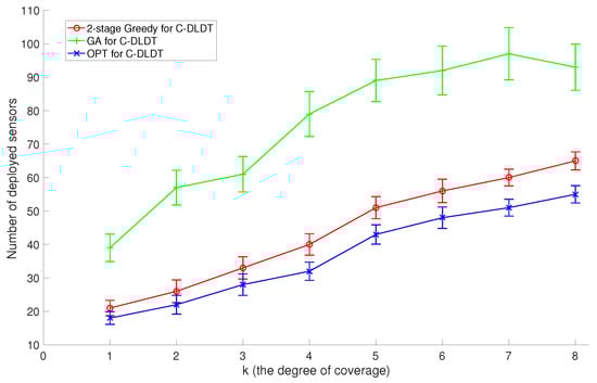 In the second set of experiments, we set the number of discrete sensor locations to 200 and the number of target points to 100, and compare GreedyDLDT with the GA-based approach and the optimal solution with different k coverage values (the degree of coverage) varying from 1 to 8. As shown in Figure 7, the increasing trend in these performance curves indicates that more sensors need to be deployed to k-cover all target points as k increases. Again, we observe that GreedyDLDT consistently outperforms the GA-based approach, and exhibits a close-to-optimal performance with a high stability.