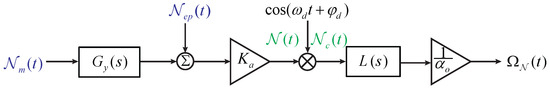 In the force-rebalance sense channel, besides the noise sources introduced in the open-loop, we model another electrical noise source at the feedback node, as demonstrated in Figure 8. The reason is that is separated from by the modulation–demodulation process in the loop and, as a result, cannot be equivalent to . The electrical noise source at the output stage is still ignored for the same reason discussed in Section 3.