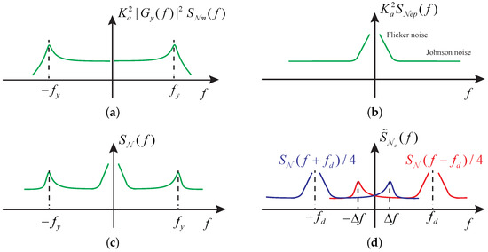 Noise propagation in the open-loop sense channel. (a) Noise power spectral density (PSD) in attributable to the mechanical noise; (b) Noise PSD in attributable to the electrical noise; (c) Noise synthesis of ; (d) Noise PSD after the modulation. .