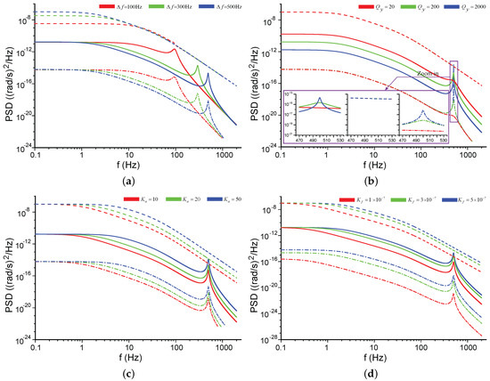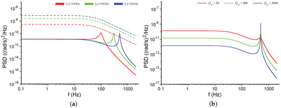 The PSD of the noise equivalent rate (NER) for different parameters in open-loop mode-split gyroscopes. Solid lines for the mechanical noise. Dashed lines for the electrical noise. (a) Comparisons between different ; (b) Comparisons between different .