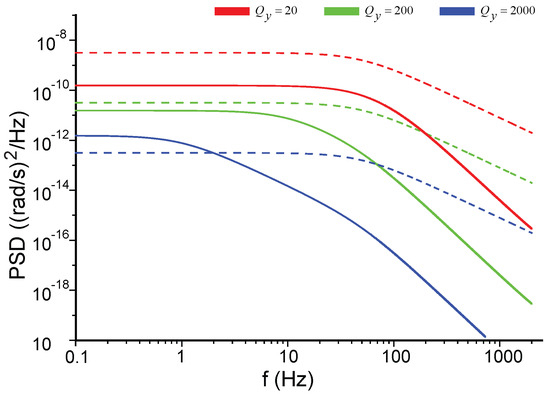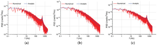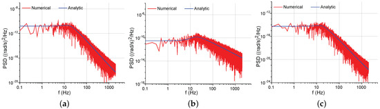 Equations (14), (22), (23), (35), (41) and (43) give the closed-form expressions of the PSD of the NER in force-rebalance mode-matched gyroscopes. Figure 12 presents the corresponding analytic and numerically simulated PSD curves. In this operation, the controller parameters are set as and . The analytic curves are in close agreement with the numerical ones, indicating the validity of the equivalent noise model.