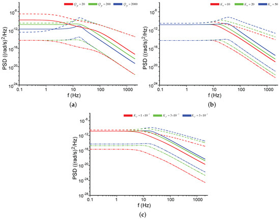 Comparisons of the PSD of the NER between different , , and are demonstrated in Figure 13. For mode-matched gyroscopes working in the force-rebalance operation, the enhancement of can significantly improve the mechanical and the pickoff electrical noise. Similar to mode-split gyroscopes in the force-rebalance operation, in low frequencies, only affects the PSD of the feedback electrical NER. From Figure 11c and Figure 13b, the gain of the signal conditioning circuit will not influence the PSD of the NER in low frequencies for both the mode-split and the mode-matched cases.