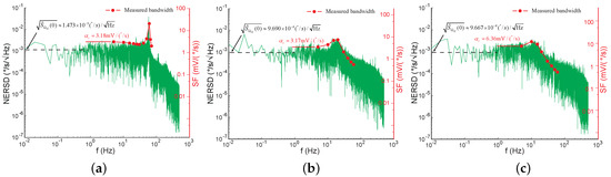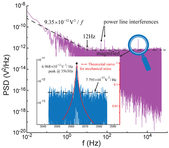 Figure 5 visualizes the noise PSD described by Equations (15)–(17) and (21). For the mechanical noise in , the PSD at is larger than those in low frequencies by a factor of , predicted by Equation (18). The flicker noise is pronounced in low frequencies, and the Johnson noise prevails in high frequencies. The crossover frequency, at which the PSD of the flicker noise equals that of the Johnson noise, is generally from several Hertz to tens of Hertz. As depicted in Figure 5c, the PSD feature of can be utilized to identify the mechanical noise and the electrical noise for situations where the Johnson noise PSD is below the peak of the mechanical noise PSD. Once the peak magnitude of the mechanical noise PSD at the resonant frequency is obtained, the overall PSD of the mechanical noise can be determined via Equation (18). An example of this procedure will be demonstrated in Section 6.
