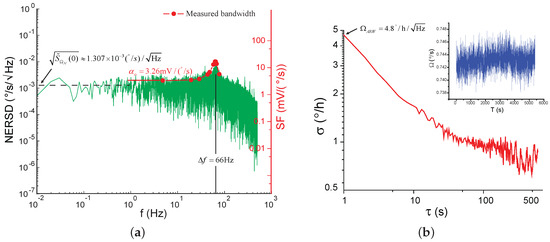 Then, the gyroscope was configured to operate in the open-loop mode-split case. Figure 16a shows the corresponding spectral density of the NER, along with the measured frequency response of the gyroscope. The output rate of the gyroscope was 1 kHz and the recording time was 100 s. The frequency response of the gyroscope was measured by an angular vibration table from 5 Hz to 80 Hz. The spectral density of the NER and the gyroscope frequency response had magnitude peaks at the same frequency, as explained in Section 4. In Figure 16a, , which was an average value between 0.01 Hz to 1 Hz. The approximated ARW was consistent with the Allan Variance in Figure 16b. To calculate the Allan Variance, the gyroscope output rate was averaged to 1 Hz, and the data was recorded for 5400 s.