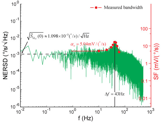 Next, a DC voltage of 5 V was applied to the frequency tuning electrodes, resulting in a decrease in from 66 Hz to 43 Hz. Figure 17 demonstrates the NER spectral density of the open-loop gyroscope and the measured gyroscope frequency response. By comparing Figure 16a and Figure 17, it can be found that the open-loop scale-factor increased by 1.546 times as the frequency split decreased by a factor of 1.535, in agreement with Equation (25). However, the ARW only improved by 1.19 times, suggesting that for the gyroscope under test, the ARW was significantly affected by both the mechanical noise and the electrical noise.