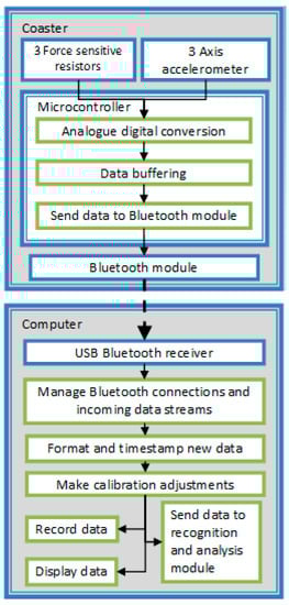 The coaster is fitted with Force Sensitive Resistors (FSRs) which are used to not only determine when the object is on the table or lifted, but can also be used to estimate how much liquid is being poured into a container. In addition to FSRs, triaxial accelerometers are used to record movement. The sensors are controlled by a Microchip dsPIC30F3012 microcontroller, which has an integrated 12 bit analogue digital converter (ADC). The microcontroller is programmed to digitize, compress and prepare the sensor data and manage the transmission of the data via Bluetooth. The data are buffered on the microcontroller so that they can be re-transmitted (avoiding data loss) if the wireless connection is interrupted for a short period. An ARF7044 Bluetooth module is used to transmit the sensor data to a host computer via a Bluetooth wireless connection (Figure 4).
