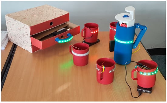 Note that, in Figure 6, some of the objects have green lights and one mug has red lights. We recognize that green and red may be problematic for color-blind people and this could be reconfigured in later designs. However, in our initial trials we do not tell participants what the lights mean but rather wait to see what interpretation the participants provide. The intention is that the behavior of the objects can both attract the attention of the user and also cues which action to perform. For example, in one trial we place the jug in front of the participant and raise the handle. If the participant does not respond to the handle rising, then the LED strip on the jug turns green. After this, an auditory cue (of the sound of pouring water) is played to draw their attention to the jug and prompt a lift and pour action, and if this fails to elicit a response a verbal prompt (with a voice recording of the phrase ‘pick me up’) is played.