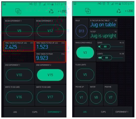 Figure 7 shows a user interface, running on an Android mobile telephone that was used to control the objects and record data from the trials. The server’s IP address must remain constant in order to ensure all devices connect to it, but the server must be able to connect to other networks (e.g., the university). This requires a DHCP reservation to be made. The server allows multiple phones to connect so multiple phones can control the experiment, but also provides some security in the connections. A local router could be implemented on a Raspberry Pi Zero which can host both the server and the local network. This raspberry pi is small enough to fit inside the jug which will result in no extra equipment needed other than the jug, spoon, cups. The network enables expansion to other objects.