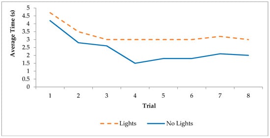 Time to complete tasks in trial one. Times for trials with and without lights are compared to a baseline condition (in which participants picked up the jug as soon as they were instructed by the experimenter).