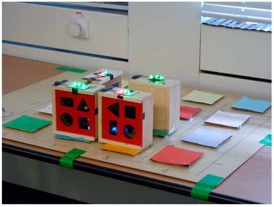 In previous work, we explored the relationship between LEDs and the state of objects in a simple problem-solving exercise []. The objective is to ensure that four boxes had satisfied their goals (Figure 9). The goal of each box was defined by a set of rules known to the box, and defined by the position of the box and its proximity to other boxes. Each box has three LEDs representing its state: one to indicate if the goal has been satisfied, one to indicate ‘communication status’ (in terms of connection with the table), and one to indicate ‘proximity’. We were interested in whether people would try to learn the ‘rules’ that the boxes were using or whether they would find it easier to learn the pattern, or arrangement of the boxes, and whether the rules or patterns could generalize to new configurations. The argument for this comparison was that the patterns could be considered in terms of ‘affordance’ [,,,]. Not only were the patterns easier to understand (which suggests that the visual cues provides useful semantic information) but also participants found it easier to generalize patterns than the rules (contrary to our expectations).