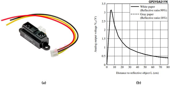 (a) Sharp GPY2Y0A21YK infrared distance sensor and (b) voltage vs. distance plot.