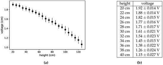 (a) Plot of measured voltage vs. distance, and (b) measured voltage ranges for some distances.