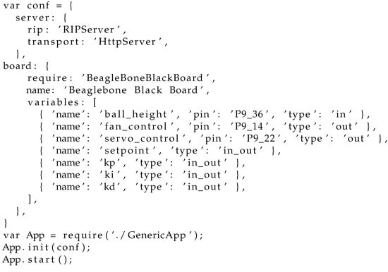 In the Air Levitation System, the hardware interface task is accomplished using the bonescript library, which basically mimics the Arduino API to cope with Beaglebone and the GPIO pins of the board. There is a real-time loop implementing the time critical actions: read sensors, update the controller and write outputs. Technically, it is not actually real time because currently it is not supported by the Node.js bonescript library. But for the time scale of the system, which is sampled at a rate, it performs correctly. In case hard real time is needed, there are other alternatives (such as C++) supported by the Beaglebone board.