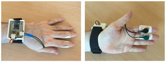 Prototype of the wearable. (Left) The wearable is put in the wrist of the non-dominant hand. (Right) The electrodes are attached to the medial phalanges in the palm sides of index and middle fingers.