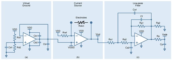 Electrodermal activity sensor building blocks. (a) Virtual ground. R = R = 100 k, C = 1 F, C = C = 100 nF, and C = 47 F; (b) Current source. R = 825 k; (c) Low-pass filter. R = 110 k, C = 1 F, R = 75 k, = 150 k, C = C = 1 F, R = R = 10 k, and C = 1 nF.