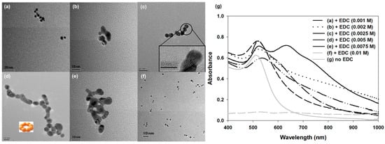 Various structure of Au-nanoparticles (NPs) and their plasmonic property. (a–f) Structural differences in AuNPs using TEM and (g) plasmonic absorbance measurement after adding varying concentrations of EDC. Reproduced from Ref. [] with permission from the Royal Society of Chemistry.