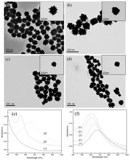 Urchin-shaped iron oxide-AuNP core/shell structure. (a–d) TEM images of iron oxide-AuNP core/shell structure; (e) UV/Vis absorbance spectra of (1) iron oxide, (2) spherical iron oxide@gold core/shell and (3) urchin type of iron oxide@gold core/shell and (f) plasmonic absorbance spectra of urchin-shaped structure depending on the concentration of seeds for assembly (1’) 4.5 nM, (2’) 8.9 nM, (3’) 13.2 nM, (4’) 17.5 nM and (5’) 21.7 nM. Copyright Wiley and Sons. Reproduced with permission [].