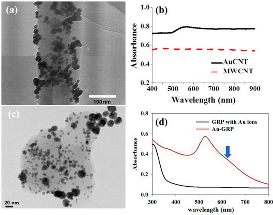 Structure of Au-CNT and Au-GRP. TEM images of (a) Au-CNT; (b) plasmonic absorbance of Au-CNT; (c) Au-GRP and (d) UV/Vis spectrum of Au-GRP as hybrid P-NM structures. (a,b) Copyright Elsevier B.V. Reproduced with permission [] and (c,d) Reprinted with permission from [], Copyright 2014, American Chemical Society.