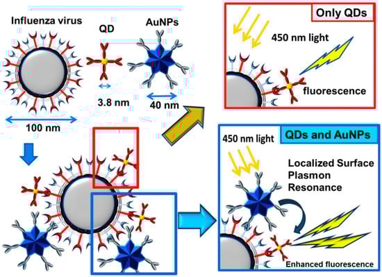 Fluorescent quantum dot (QD) was used to monitor the viral antigen. If QD is located near the P-NM, its fluorescence intensity can be enhanced by the LSPR-based PRET effect [,,]. Therefore, if the target virus existed in the antibody (Ab) modified P-NM/QD system, key and lock interaction would occur between the target virus and P-NM/QD. As a result, the fluorescence intensity of QD could be enhanced by energy transfer in the virus/P-NM/QD structure. Depending on the concentration of viral antigen, the fluorescent enhancement factor was affected, and as the amount of the virus increased, the QD fluorescence gradually increased. In this study, the limit of detection (LOD) for the influenza virus was estimated at 0.03 pg/mL in deionized water and 0.4 pg/mL in a serum matrix. In addition, clinically isolated influenza virus was detected with 10 PFU/mL detection limitations. Moreover, this system was highly selective against other biomolecules. In a different study, Zika virus RNA was monitored using Au-Ag core/shell P-NM and QD []. The target RNA was detected by a similar approach to the influenza method. The molecular beacon was modified on the QD surface to capture the target RNA. When Zika virus RNA was placed in this system, hybridization occurred, resulting in enhanced fluorescence intensity. In this case, the LOD was 2.4 copies/mL, with extremely high selectivity.