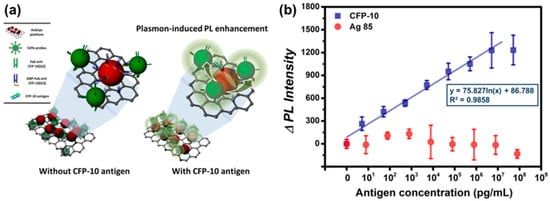 MNP-GRP or MNP-CNT can also be used as LSPR substrate for PRET-based sensing systems to monitor the viral antigens. Lee et al. detected infectious TB antigen by using TB Ab-modified Au-GRP and QD through PRET-based fluoro-immunoassay (Figure 5a) []. In this study, a sandwich structure was formed with Au-GRP and QD by the TB antigen, i.e., CFP-10 and fluorescence enhancement of QD was measured by the antigen concentration. In Figure 5b, the sensing performance is depicted, and as the target antigen concentration increased, the fluorescence intensity linearly increased. The LOD was estimated at 4.5 pg/mL. Moreover, other TB antigens, such as Antigen 85, were not monitored, thus it showed excellent selectivity. Au-CNT can also be a P-NM for fluoro-immunoassay, and the influenza virus was monitored by a similar strategy with an Au-GRP sensing mechanism []. Here, Au-CNT/QD was assembled as a sandwich structure by the influenza virus, resulting in enhanced fluorescence with each virus concentration. It was highly sensitive with 0.1 pg/mL, and a clinically isolated influenza virus was also detected with a 50 PFU/mL detection limitation.