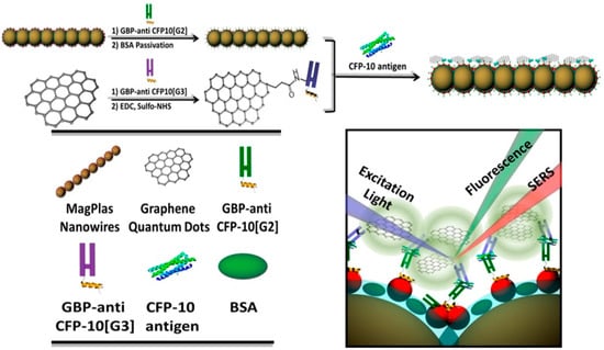 - Zou, F.; Zhou, H.; Tan, T.V.; Kim, J.; Koh, K.; Lee, J. Dual-mode SERS-fluorescence immunoassay using graphene quantum dot labeling on one-dimensional aligned magnetoplasmonic nanoparticles. ACS Appl. Mater. Interfaces 2015, 7, 12168–12175. [Google Scholar] [CrossRef] [PubMed]