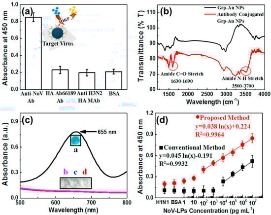Such P-NM-based plasmonic structures could be applied to a colorimetry sensing platform due to the catalytic properties from free electrons []. This means that P-NM possesses enzyme activities, and this material-based sensing system can be an alternative to the enzyme-linked immunosorbent assay (ELISA) system []. For example, Rahin and colleagues detected Norovirus-like particles (No-VLPs) using Au-GRP as an enzyme-like catalyst (Figure 7) []. First, a specificity test was confirmed on various viruses and a color change was only observed in No-VLP (Figure 7a). Ab conjugation with Au-GRP was confirmed by FT-IR analysis (Figure 7b). In this case, Au-GRP induced the oxidation of the peroxidase substrate 3,3,5,5-tetramethylbenzidine (TMB) with H2O2, resulting in the appearance of a blue color in the aqueous solution (Figure 7c). Through an improved colorimetry sensing response, the LOD for the No-VLPs in this system was improved to 92.7 pg/mL, which is 112 times higher than that of conventional ELISA (Figure 7d).