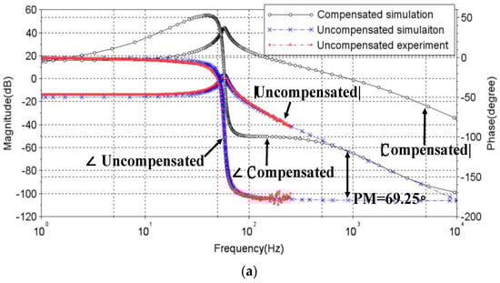 where and are the zero and pole of the lead controller while and are the zero and pole of the lag controller, respectively. is the proportional gain. The determination of realistic values of , , and starts with setting the final control goals for the closed-loop system of a commercial OIS with a transient period, ts, less than 0.02 s [18] and the overshoot limited by 5%. The overshoot of 5% leads to the damping ratio, ζ, of 0.6925, and equivalently, a phase margin (PM) of 69.25°. The desired condition of ts < 0.02 s together with the determined ζ of 0.6925 decide the poles of the final closed-loop system as in [19],