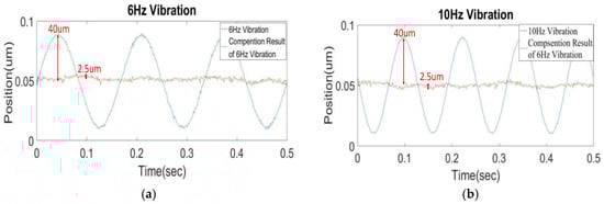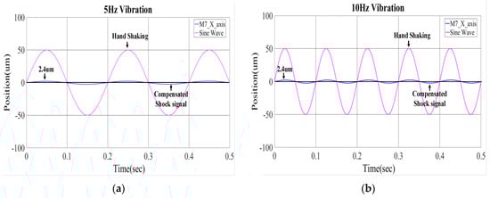 Figure 12a,b show the experimental results with the hand-shaking applied to both x and y axes of the OIS, while two controllers are also activated on both x and y axes to stabilize the lens holder. Figure 12a shows the results with the disturbance equally applied by the shaker on the x and y axes of the OIS, while unequal disturbance is shown in Figure 12b. It is seen from both figures that the controller is able to robustly stabilize the lens holder to be nearly motionless to relative to ground with residual vibration around 5 μm, thus significantly minimizing image blurs.