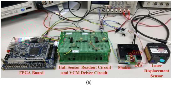 Experiments were conducted to test the performance of the designed lead-lag controller for stabilizing the lens holder relative to ground, with the aim of reducing imaging blur. Figure 9a shows the setup for conducting the experiments, while Figure 9b illustrates the connection between the device and instruments. In this experimental system, there is an OIS driven by a current drive IC to drive the the lens holder in OIS along x- and y-directions, a tranlational 2-DOF shaker to simulate hand-shaking disturbance to the OIS, an FPGA board realizing the designed lead-lag controller, and a laser displacement sensor to measure the movement of the lens holder. There are also Hall Effect sensors built into the OIS to measure the real-time motion of the lens holder relative to the OIS image base, and a gyroscope for measuring the motion of the shaker as mimicking hand shake.