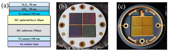 (a) Schematic diagram of a 4H-SiC Schottky diode detector; photograph of a 4H-SiC detector in a 2 × 2 array mounted on a multi-layer PCB plate (b) and in a ceramic case (c) with a total sensitive area of 4 cm2.