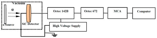 The response of the SiC detectors to charged particles was studied experimentally with the alpha sources in a vacuum chamber in Nuclear Institute of Northwest Technology (NINT) in Xi’an, China. One alpha source was mixed with 243Am (Eα = 5.275 MeV, branch ratio of 87.5%) and 244Cm (Eα = 5.805 MeV, a branch ratio of 76.4%) with a radioactivity of 1.8 × 103 Bq, the other was 239Pu (Eα = 5.157 MeV, branch ratio of 73.3%) with a radioactivity of 1.2 × 105 Bq. Both alpha sources were prepared via the electro-deposition of oxidized isotopes on stainless-steel plates—one with a diameter of 10 mm and the other of 30 mm. As shown in Figure 2, the alpha sources were positioned concentrically with the detector’s sensitive layer, 80 mm away from the detector. The signals from the detector were amplified by an Ortec-142B Pre-Amplifier and an Ortec-672 Amplifier with a shaping time of 1 μs and a gain of 50, and were then analyzed by an Ortec multichannel analyzer (MCA) and Gamma-Vision software. The reverse bias voltages of 0–500 V were applied to the detector by the PS350 bias supply through the Ortec 142B preamplifier.