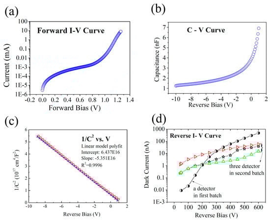 Both the forward I-V and C-V curves of the detector were measured using Agilent B1500A Power Device Analyzer/ Curve Tracer. The dark current was measured by Keithley 6517A Ampere Meter in a shielded copper box in darkness. A PS350 high voltage supply (Stanford research system Inc., Sunnyvale, CA, USA) was used to provide the reverse bias.