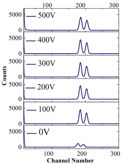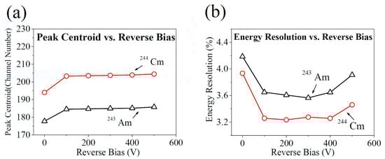 Figure 4 shows the response spectra of the detector to the alpha particles emitted by the source of 243Am-244Cm at the reverse bias voltages of 0, 100 V, 200 V, 300 V, 400 V, and 500 V. It is worth noting that the detector attained similar alpha response spectra and worked stably at reverse bias voltages no less than 100 V, but measurable numbers lost amounts of incident events induced by alpha particles at a reverse bias of 0. Figure 5a gives the peak centroid as a function of reverse bias voltage. The peak centroid in the spectrum at 0 V (without reverse bias) is about 5% lower than those in the other spectra at the reverse bias voltages of 100–500 V. Fitting the peaks obtained above by the Gaussian function, we got the full width at half maximums (FWHMs). By dividing the FWHM by the peak centroid, we got the energy resolution as a function of reverse bias (Figure 5b). The best energy resolution is at 200 V and 300 V. The rise of energy resolution at reverse bias voltages above 400 V can be due to the increase in the SiC detector’s white noise, which could increase the detector’s electronic noise and broaden the alpha peaks.
