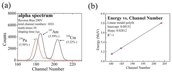 Response spectra of the 4H-SiC detector to the alpha particles from the sources of 239Pu,243Am, and 244Cm at a reverse bias of 200 V: (a) alpha counts as a function of channel number; (b) linear fitting of alpha particles’ energy vs. channel number of peak centroid.