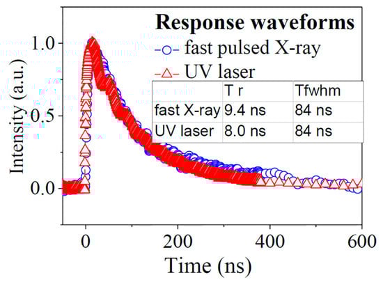 The response waveforms of the SiC detector to the pulsed X-rays and UV-light are shown in Figure 7. If the pulse height of the detector for the two pulsed sources were normalized, the response waveforms would be little different. The rise time for X-ray and UV-light waveforms is 9.4 ns and 8.0 ns, while the FWHM for X-ray and UV-light waveforms are both 84 ns. The difference can be attributed to the fact that the excitation of charged carriers occurred in the whole sensitive volume for X-rays, while for UV-light, it only occurred in the thin layer of sensitive volume near the incident surface.