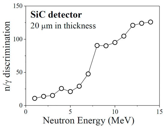 We studied the n/γ discrimination of the detectors with a thickness of 20 μm and for the neutrons of 14 MeV and γ-rays of 1.25 MeV using MCNP-4C Code [], and the results are shown in Figure 8. The n/γ discrimination for the neutrons of 14 MeV and the γ-rays of 1.25 MeV is 126, over nine times higher than that of a silicon detector (300 μm in thickness) and seven times higher than that of a diamond detector (300 μm in thickness) according to the results acquired in our former research [], respectively. In neutron detection, γ-rays always exist in the background. The SiC detector with a thin sensitive volume can attain a low response to background radiation and high n/γ discrimination, and then attain a high signal/noise ratio. As a result, the thin detector shows great advantages in neutron detection in complex radiation fields.