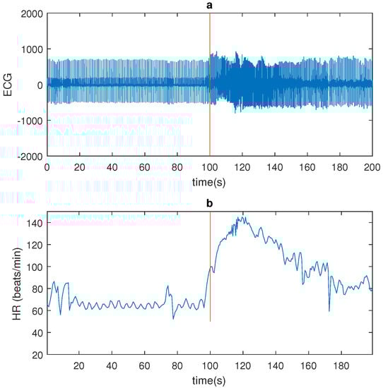 An example of a seizure (patient 4): (a) Electrocardiography (ECG) signal (bandpass filtered 1–40 Hz). (b) Heart rate (HR; red line indicates seizure onset as market by a clinician on the basis of electroencephalography (EEG)).