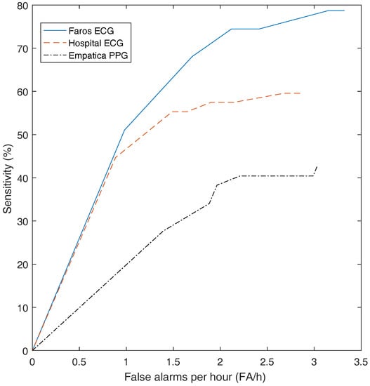 The false alarms rate per hour for the three detection systems were around 2 FP/h (Table 2), which is comparable with those in the literature [6]. A comparison between different state-of-the art HR-based independent detection algorithms is included in [6]. These algorithms have on average two false alarms per hour, which is not acceptable for practical use. In order to reduce false alarms, a patient-dependent or adaptive algorithm should be considered. An algorithm with tunable parameters and thresholds is provided in [14,15]. In this case, medical data should be available for that patient. In [27], an online algorithm is developed, which starts from a patient-independent algorithm and adapts to the characteristics of the seizures of that specific patient. For this, no data of the patient is needed beforehand. Another way to reduce false alarms is the combination of multiple signals. Depending on the seizure characteristics, other biomedical signals can be integrated [4]. However the aim of this paper is to compare the performance of an ECG and a PPG wearable device with the ECG hospital system, not to outperform the state-of-the-art seizure detection systems.