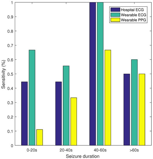 Table 2 gives an overview of the results. The highest sensitivity (70%) was obtained with the wearable ECG, whereas the sensitivity of the hospital ECG was 57%. With the wearable PPG, a sensitivity of only 32% was obtained. The FP/h values are comparable for the three recording systems: 1.92, 2.11 and 1.80 for the hospital ECG, the wearable ECG and the wearable PPG, respectively. In Figure 2, the sensitivity and false alarm rate for different thresholds of the SVM classifier are plotted. This curve shows that for the same FP/h value, the wearable ECG achieved a higher sensitivity than the hospital ECG, whereas the wearable PPG had a lower sensitivity. Additionally, sensitivity was calculated for seizures of different durations, namely, 0–20, 20–40, 40–60, and >60 s. In Figure 3 the sensitivity is plotted for the hospital ECG, the wearable ECG and the wearable PPG for the different seizure durations. The seizures with an unknown seizure duration were neglected by this analysis. Unfortunately, the number of seizures in each of the seizure length categories (9, 9, 3 and 10) were too small to draw conclusions.